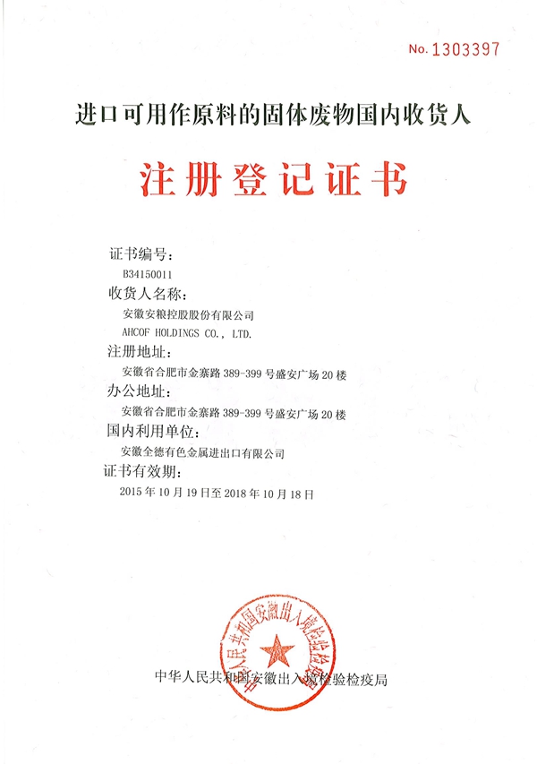 10月19日,安徽省出入境檢驗(yàn)檢疫局向公司正式核發(fā)《進(jìn)口可用作原料的固體廢物國內(nèi)收貨人》注冊(cè)登記證書。
