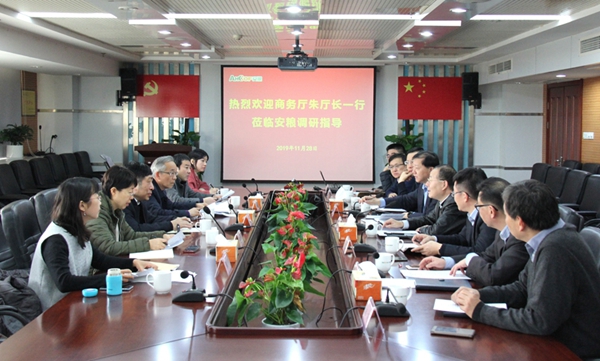 11月28日,安徽省商務(wù)廳朱丹副廳長(zhǎng)到公司開展外貿(mào)工作調(diào)研,一同調(diào)研的有省商務(wù)廳貿(mào)發(fā)處、貿(mào)管處、產(chǎn)業(yè)處相關(guān)領(lǐng)導(dǎo)。國(guó)貿(mào)集團(tuán)黨委書記、董事長(zhǎng)范陽(yáng)率安糧集團(tuán)領(lǐng)導(dǎo)班子及貿(mào)易板塊主要負(fù)責(zé)人參加調(diào)研座談。