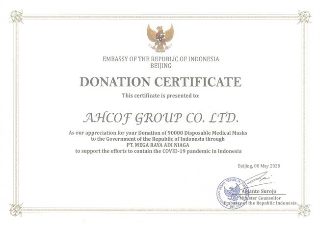 5月8日,印尼駐華大使館向安糧集團發(fā)來捐贈證明書,以此表達對安糧集團捐贈印尼政府9萬只口罩之舉的誠摯感謝!